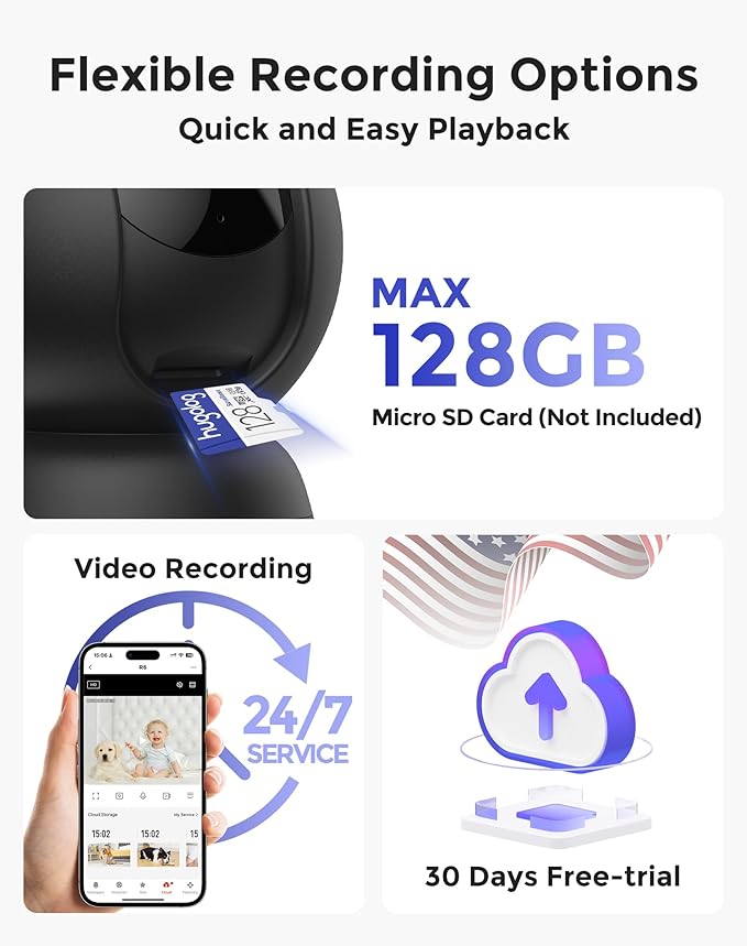 - US Cloud Storage & SD Card Storage: The indoor security camera supports encrypted cloud storage in the US and a built-in microSD slot up to 128GB; ensuring your high-quality 4K day and night color footage is safely stored locally or in the cloud