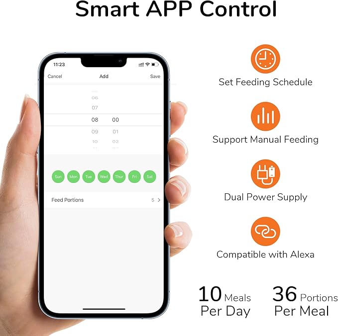 - Smart APP Control - FUKUMARU automatic cat feeder supports 2.4GHz WiFi, allowing you to program and monitor your pet's diet anytime, anywhere through the Smartlife APP for iOS and Android phones. You can develop a feeding plan and schedule for your pet, with a maximum of 10 meals per day, 1-36 servings per meal, approximately 0.28OZ per portion. (Double click the button on the feeder to manually feed one portion of food)