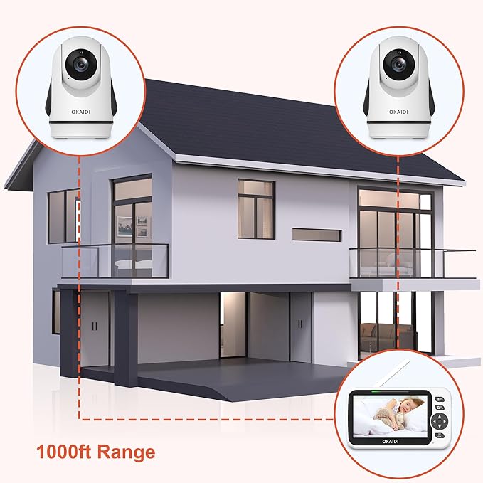 OKAIDI Video Baby Monitor with 2 Cameras, 5" Display Baby Monitor No WiFi, 30H Battery and 1000ft Range, Remote Pan-Tilt-Zoom Baby Camera, 2-Way Talk, 8 Lullabies, for Baby Pet Elderly