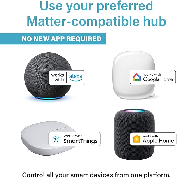- Matter Hub Required. A Matter-compatible hub is required for successful setup. Most leading smart home hubs and assistants are compatible out-of-the-box with Matter – Apple HomeKit, Google Home, Amazon Alexa, and Samsung SmartThings. Refer to smart home details with manufacturer