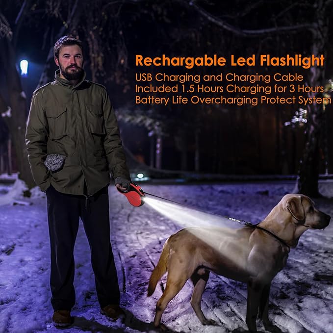 - 【Upgraded High-Intensity Led Flashlight】Our high-quality retractable dog leash with led light function allows you to clearly see the road ahead while walking your dog. The front bright LED spot lamp is visible within 10 meters at the dark; The black webbing with a reflective strip ensures visibility and safety for walking at night.