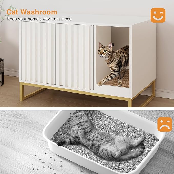 - Stylish and Durable Cat Washroom:The cat washroom storage bench featuring a mix of solid wood-effect finish,black-finished iron and thick solid fluted panels which are specially crafted with care and precision and creates a contrasting,bold and clean look.The thickened steel tube bottom frame provides strong support for the cat litter cabinet,sturdy and durable.