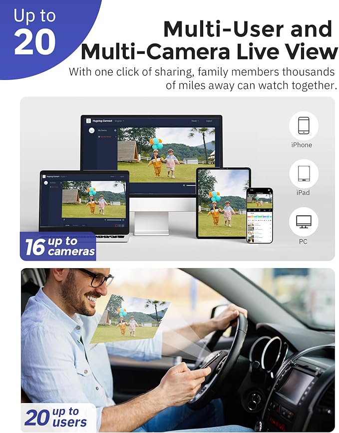 - Storage Options & Sharing: Choose cloud storage in the US or a microSD card slot; encrypted cloud keeps videos safe; share access with up to 20 people and view up to 9 live feeds simultaneously on one account