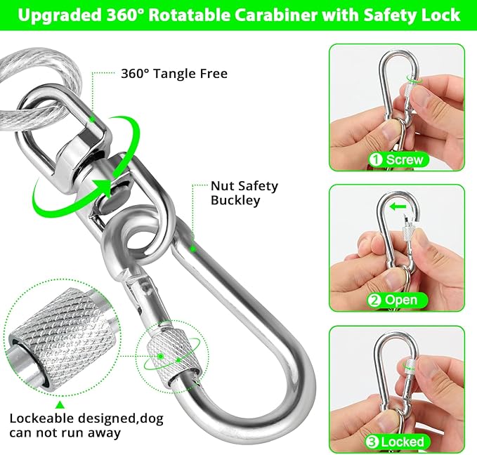 - [Upgrade Heavy Duty Buckle & 360° Tangle Free] The dog runner cable use heavy duty locking carabiner, stronger and more durable, with a 360° smooth rotation axis, your dog can run freely without getting tangled.