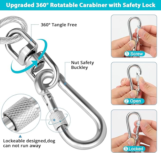 - [Upgrade Heavy Duty Buckle & 360° Tangle Free] The dog runner cable use heavy duty locking carabiner, stronger and more durable, with a 360° smooth rotation axis, your dog can run freely without getting tangled.