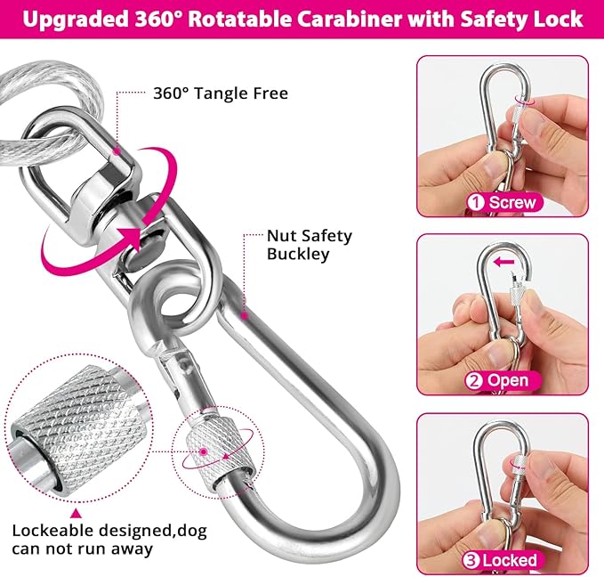 - [Upgrade Heavy Duty Buckle & 360° Tangle Free] The dog runner cable use heavy duty locking carabiner, stronger and more durable, with a 360° smooth rotation axis, your dog can run freely without getting tangled.