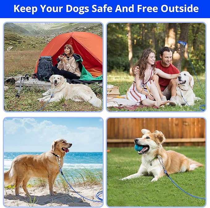 - [Lightweight And Easy To Use] The metal dog tether with safety lock has various methods of use, tie to a tree or stake, you can use this dog cable to keep your pet safe in yard, garden, camping, training and other outdoor activities. The dog line is lightweight and easy to carry out.