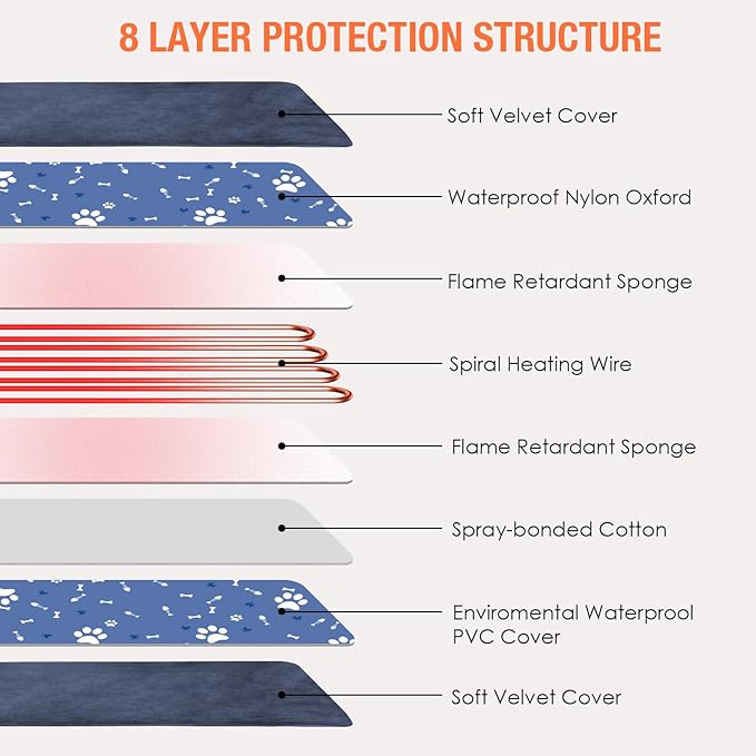 - Safety 8 layer Structure Pet Heating Pad: Inner layer - heated cat pad is UL-certified heating wire to heat evenly and protect pets from overheating, two-sided flame-retardant knit for temperature lock. Outer layer - heated pad for cats has a waterproof Oxford cover for scratch-resistant, a soft washable velvet cover for machine wash
