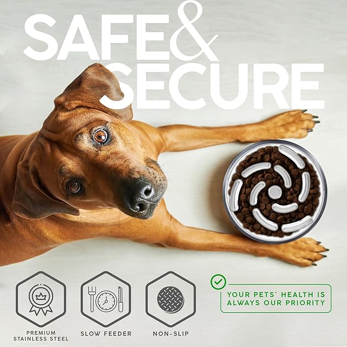 - Pet Safe: Made with BPA-free materials, our stainless steel slow feeder dog bowl and premium slow feeder insert for dog bowl ensure a safe and healthy dining experience for your furry friend. Designed to double as no-spill water bowls and insulated feeders, they keep food and water fresh longer. The sturdy, wide base with a bottom suction cup anchors the bowl securely during mealtime, providing stable, spill-resistant feeding—even for energetic eaters. Whether you’re looking for a complete slow feeder dog bowl or a reliable slow feeder insert, we’ve got you covered.