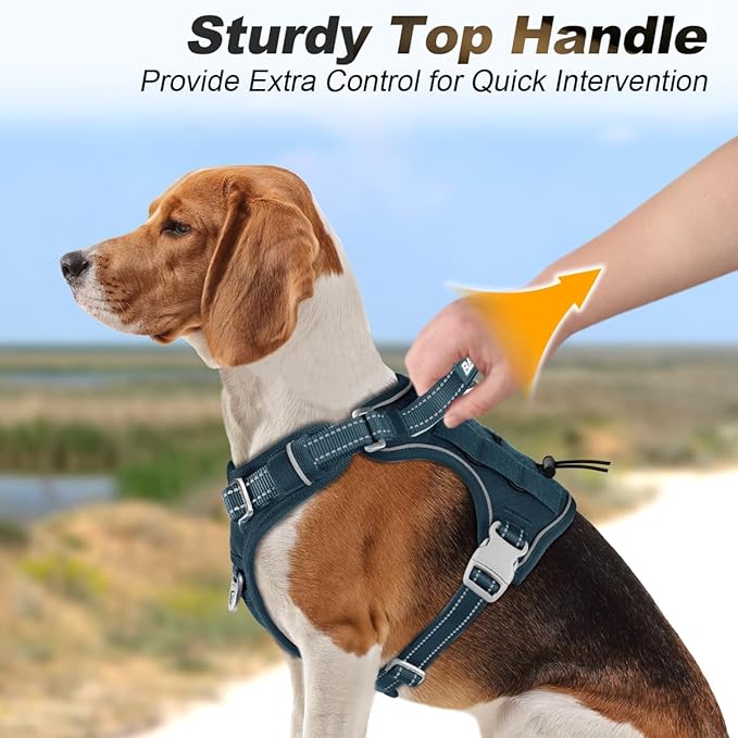 - **Advanced No-Pull Design**: No more worrying about tugging during walks.Equipped with a front-clip design,it effectively reduces pulling,making your dog-walking experience more enjoyable and relaxed.The added top handle offers immediate control,perfect for quick corrections