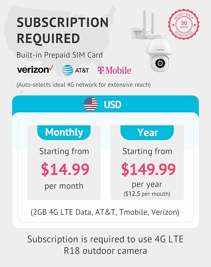 - 4G LTE & Enhanced Security: Built-in IoT SIM works with Verizon, T-Mobile, AT&T; auto-selects best signal; covers areas WiFi can't(barns, farms, ranches...); Monthly data plans: $14.99 or discounted $149.99/year