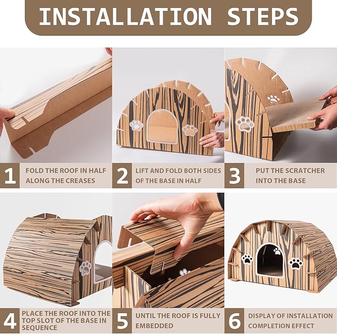 - 【SPACIOUS FOREST LODGE DESIGN FOR INDOOR CATS】Transform your home with this stylish cardboard cat house featuring a charming forest cabin look; provides a cozy hideout for play and rest, measuring 20"L x 16"W x 13"H for ample room.