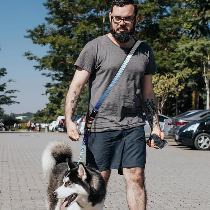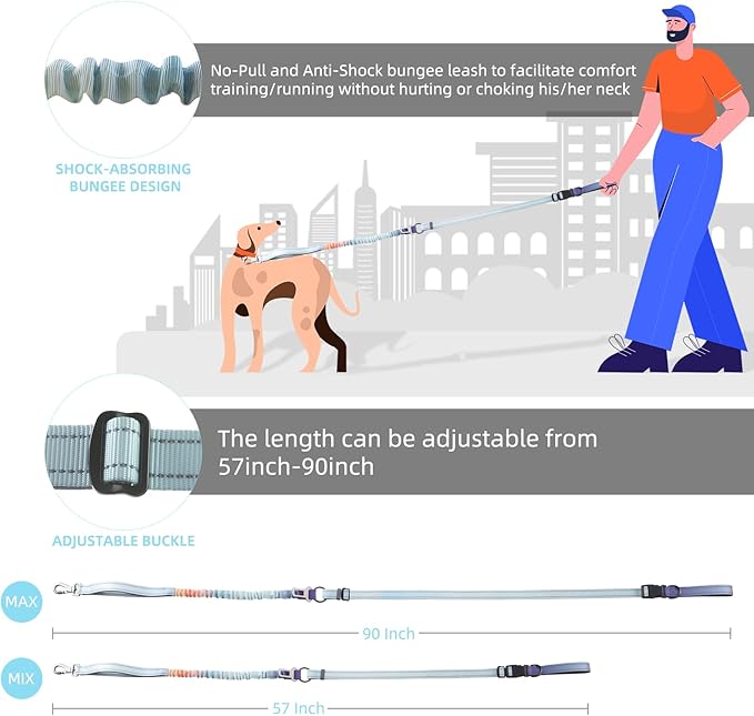 - 【Hands Free Dog Leash】Heavy duty leash material, allows for hands-free movement, providing a more comfortable and enjoyable experience for both you and your furry friend. The leash or belt aren't too heavy for you all, they're sturdy but light weight. Designed with the reflective strip for visibility at night. The bungee leash can be detached from the waist belt and used as a hand leash. It can also be used as a hand lead while still attached to the waist belt for extra security.