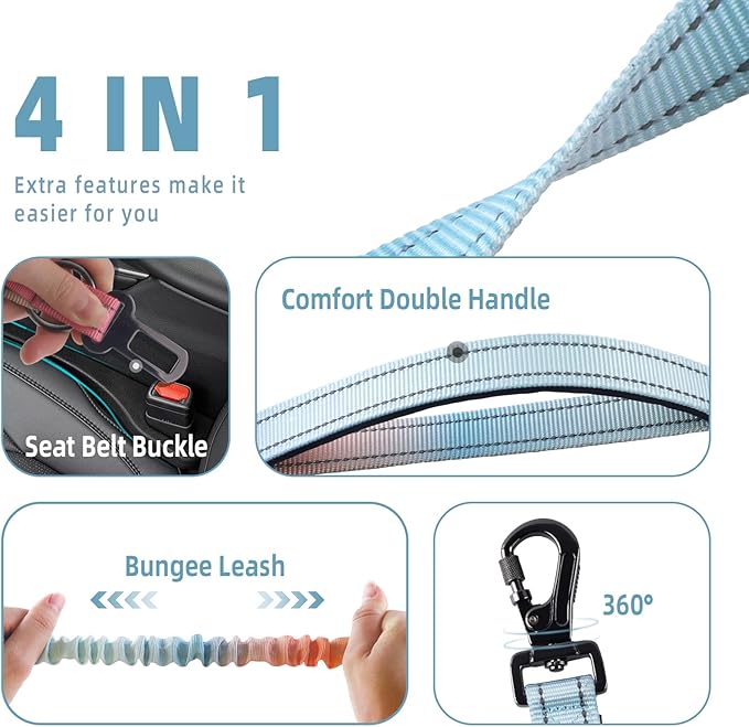 - 【Safety Belt Buckle】The bungee dog leash builts in a seat belt clip closer to the top handle for car rides! It can insert it directly into the seatbelt slot to ensure the safety of pets in the car, which really makes it an all-in-one leash.