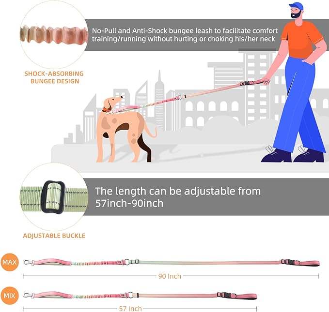 - 【Bungee Dog Leash Extension】4ft (3'8"-4'9") and 6ft (5'0"-6'7"). 1" width bungee dog leash improves control and cushion,sturdy waist bungee style leash lead could fit a large variety of waist sizes and is adjustable in fit around the waist.The bungee / elastic in the leash gives the dog a little extra leeway when you're on walks.