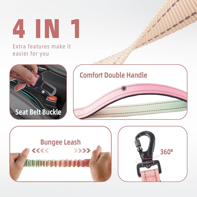 - 【Safety Belt Buckle】The bungee dog leash builts in a seat belt clip closer to the top handle for car rides! It can insert it directly into the seatbelt slot to ensure the safety of pets in the car, which really makes it an all-in-one leash.