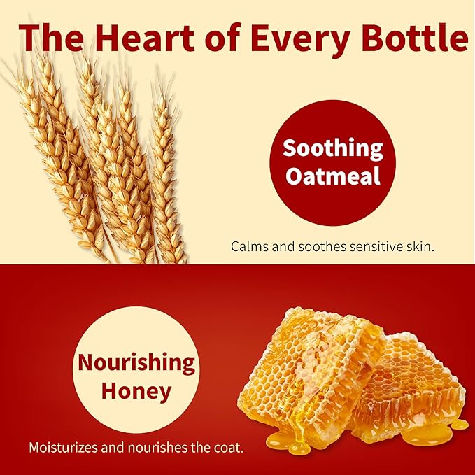 - 🌿 NATURE'S SOOTHING RELIEF | OATMEAL & HONEY FOR ITCHY SKIN Is your pet constantly scratching? Find calming relief with our plant-based formula. Enriched with natural Oatmeal to soothe irritation, and Honey to hydrate and nourish, this shampoo helps calm dry, itchy, and sensitive skin. Ingredients like Matricaria Flower Extract and Wheat Germ Oil work together to support a healthy, resilient skin barrier, directly addressing the root cause of discomfort.