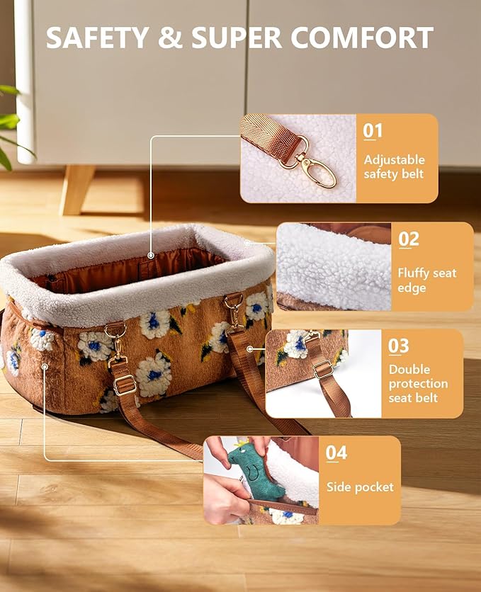 - Comfortable and Safe: The top handle comes with a furry seat edge, providing a comfortable dog bed for small dogs. The removable fluffy cushion is wrapped in soft velvet fabric, keeping your furry friend relaxed during the journey.The exterior of the dog car seat is a unique three-dimensional pattern design for a better look.