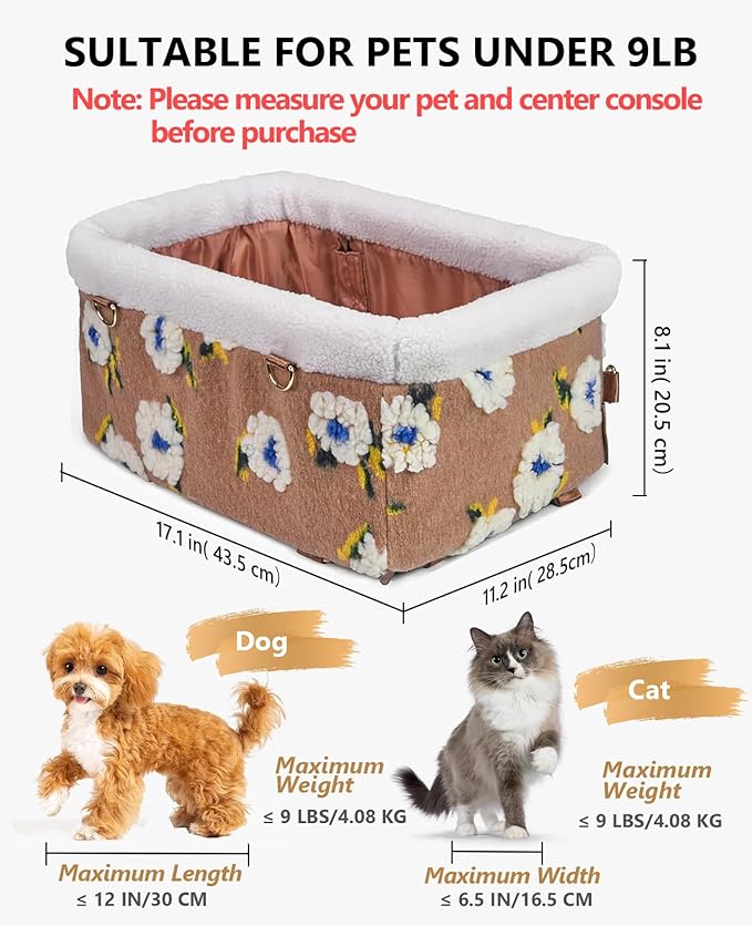 - Wider and Larger: (NOTE:Before purchasing, measure your dog and the dimensions of your center console for the right fit.) Our double protection seat belts design can raise the seat position, making it suitable for most car models. We recommend it for small dogs or cats under 9 lbs. Product Dimensions: 17.1D × 11.2W × 8.1H inches.