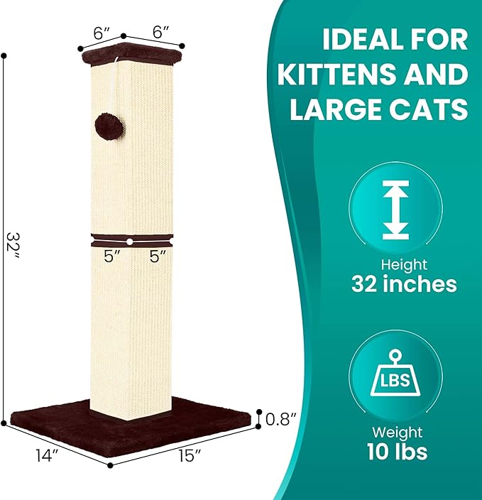 - Natural Sisal: The 32-inch high natural sisal cat scratching post is made of high-quality, natural sisal material that is gentle on your cat's paws and completely safe for them to scratch and play with.