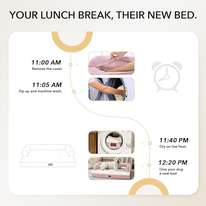 - Ultimate Easy-Clean Design: The entire cover (including bolsters) is fully removable, machine washable, and dryer-safe on low heat. It significantly reduces cleaning time, making it effortless to maintain with weekly washes. Since only the cover needs cleaning, it dries quickly and can be reinstalled promptly—keeping your dog’s bed clean and ready for use. (Tip: Remember to zip up before washing.)