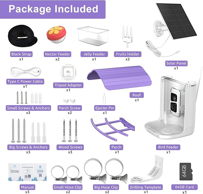 - 【5 DIY Add-ones & Squrirel-proof】The smart bird feeder come with 1.8L large capacity container and 5 different feeders: 2 fruit forks and 2 hummingbird feeders and 1 jelly box to attract hummingbirds, orioles, and other birds. With a built-in microphone and speaker, you can hear the sound of birds and repel annoying squirrels through the app