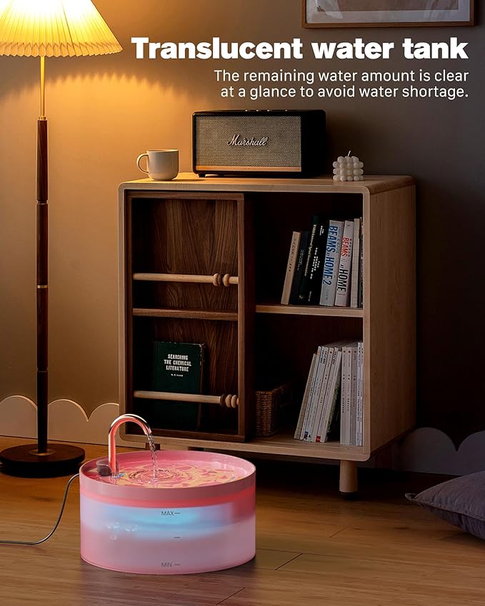 - 【Humanized Design】 In order to make it easy for the owner to check the amount of water in the ABCD and refill it in time, the dog water fountain's water storage tank is made translucent and water level line design. The LED light of the water pump allows you to observe it easily even at night. The machine can be easily disassembled and the smooth curved design makes the cleaning process without dead ends.