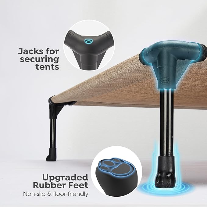 - Say Goodbye to Anxiety! Our dog cot is composed of powder-coated steel tube, durable textilene fabric, and non-skid rubber feet. Strong stability and high load-bearing capacity means saying goodbye to the fear of a sudden bed collapse.