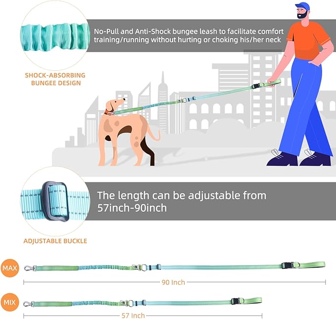 - 【Hands Free Dog Leash】Heavy duty leash material, allows for hands-free movement, providing a more comfortable and enjoyable experience for both you and your furry friend. The leash or belt aren't too heavy for you all, they're sturdy but light weight. Designed with the reflective strip for visibility at night. The bungee leash can be detached from the waist belt and used as a hand leash. It can also be used as a hand lead while still attached to the waist belt for extra security.