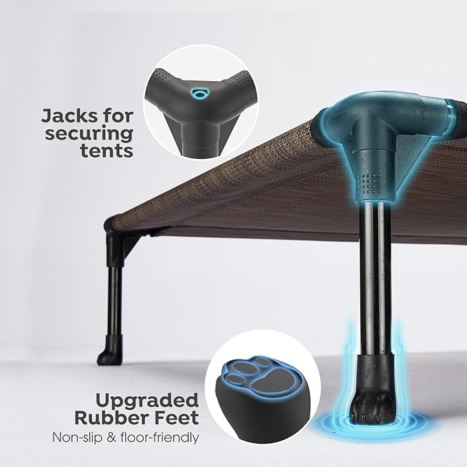 - Say Goodbye to Anxiety! Our dog cot is composed of powder-coated steel tube, durable textilene fabric, and non-skid rubber feet. Strong stability and high load-bearing capacity means saying goodbye to the fear of a sudden bed collapse.