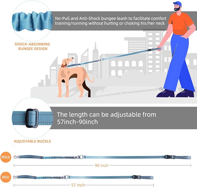 - 【Hands Free Dog Leash】Heavy duty leash material, allows for hands-free movement, providing a more comfortable and enjoyable experience for both you and your furry friend. The leash or belt aren't too heavy for you all, they're sturdy but light weight. Designed with the reflective strip for visibility at night. The bungee leash can be detached from the waist belt and used as a hand leash. It can also be used as a hand lead while still attached to the waist belt for extra security.