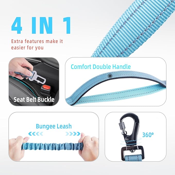 - 【Safety Belt Buckle】The bungee dog leash builts in a seat belt clip closer to the top handle for car rides! It can insert it directly into the seatbelt slot to ensure the safety of pets in the car, which really makes it an all-in-one leash.