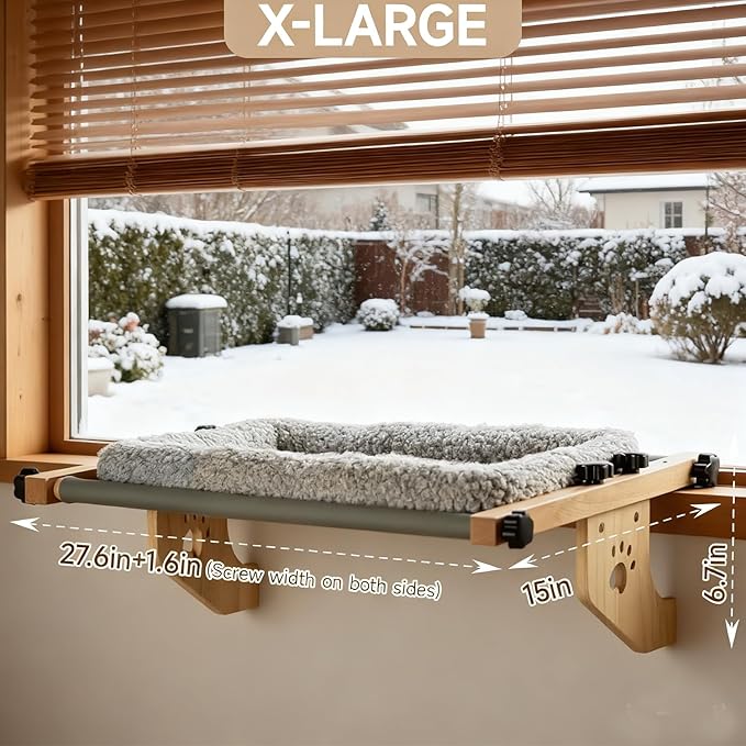 Cat Window Perch - Drill-Free Adjustable Sill Hammock, Sturdy Wood & Metal Frame, Washable Non-Slip Bed Cover, Easy Install for Indoor Cats & Multi-Cat Families (Grey,XL)