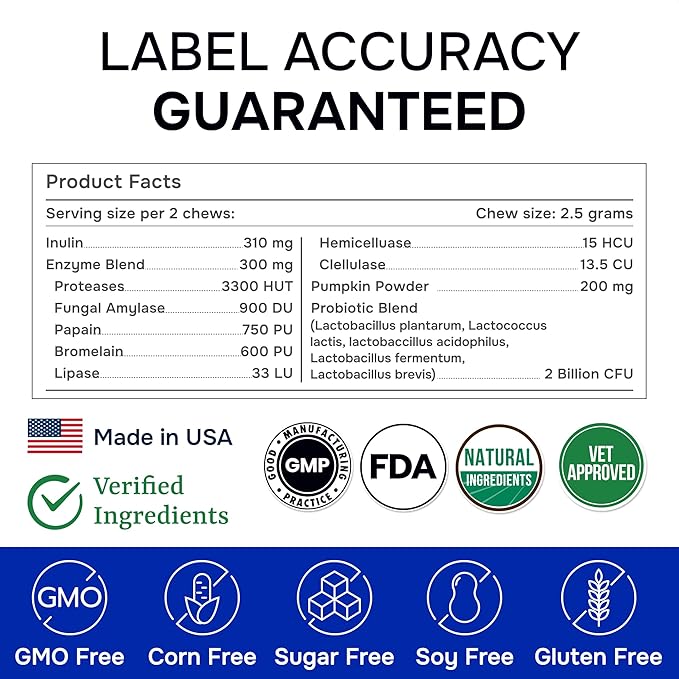 - Top-Tier Probiotic Treats: Offering the best in dog digestive support, our chewables are packed with probiotics, prebiotics, enzyme & pumpkin fiber to maintain your doggie's active and healthy life.