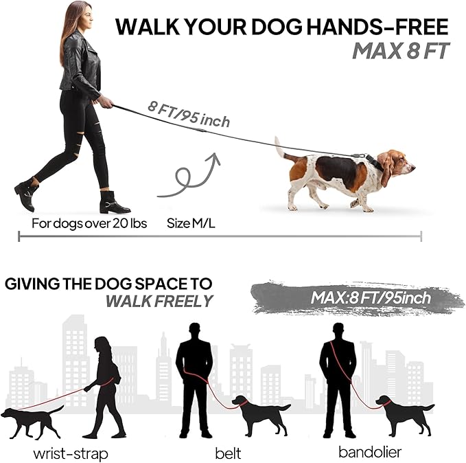 - Multifunctional - The hand free dog leash can be used in multiple ways to suit different activities and preferences. It functions as a crossbody dog leash, a conventional wrist-strap dog leash, or as a waist leash for dog walking. This hands free leash providing flexibility for both leisurely walks and more active outings