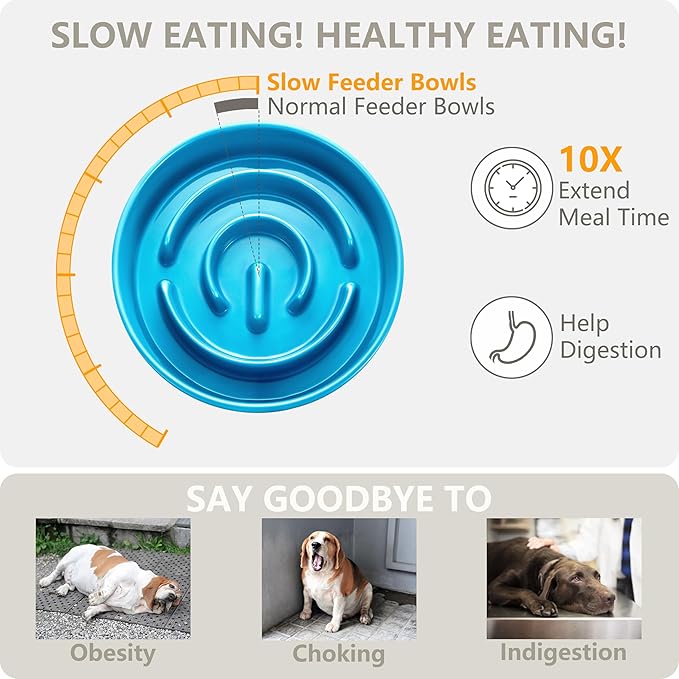 - 【Slow Eater Bowl】Change your dog's fast and excessive eating behavior — Pets that eat quickly tend to get fat and choke, which can make the dog sick. Our innovative slow feeder dog bowl is meticulously crafted to encourage your dog to eat at a slower pace, extending mealtime by 10 times.