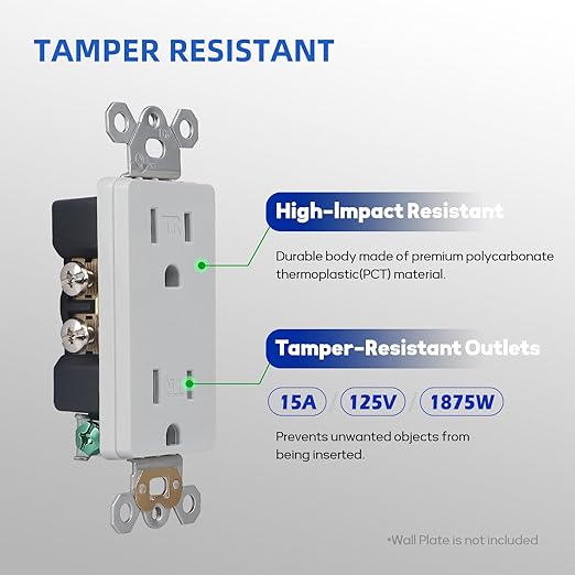 - TAMPER-RESISTANT: Tamper-resistant receptacles are designed to prevent the insertion of unwanted objects; This child safety feature ensures that only correctly angled plugs can be inserted into the receptacle