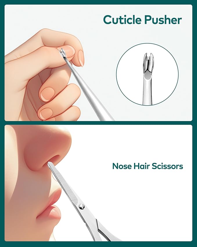 - 8 PCS Manicure Kit - Professional manicure set includes a large and medium splash-proof nail clipper, an angled nail clipper, a cuticle trimmer, a nail file, a cuticle pusher, an ear wax remover and nose hair scissors