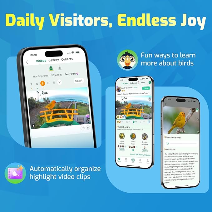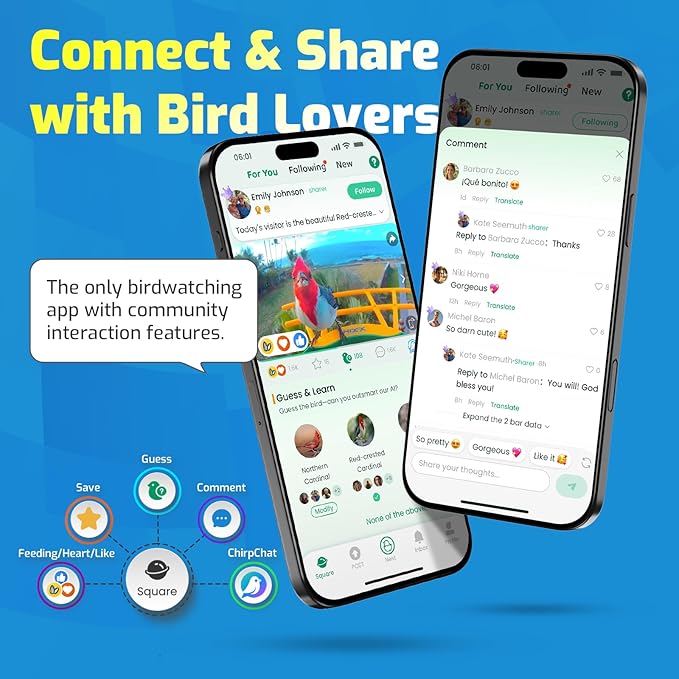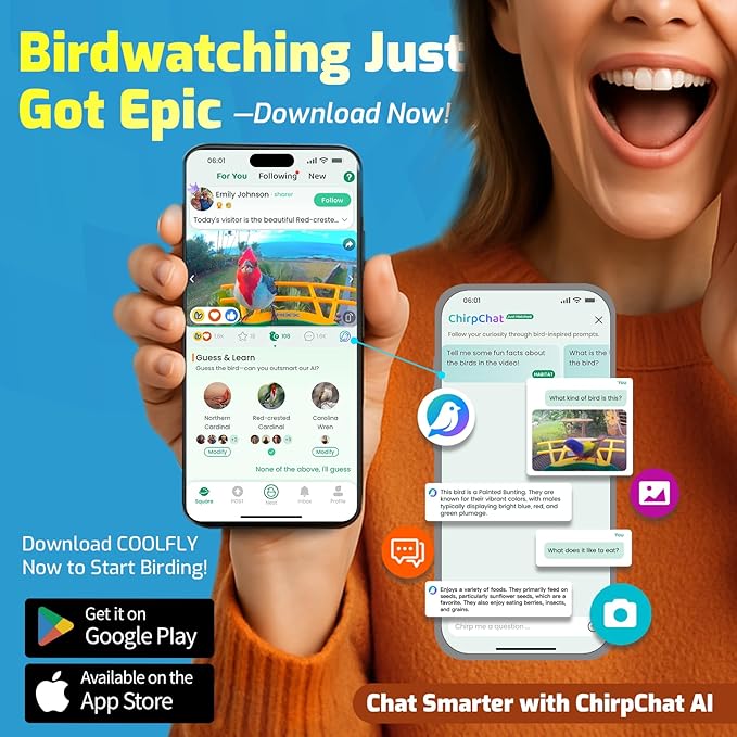 - Smart Bird Feeder with Camera: HIXX Smart Bird Feeder pairs with CoolFly App for interactive birding, which combines AI bird ID(10,000+ species) with vibrant community features like video share, comments, etc. Helping bird lovers to learn more about bird features of all kinds when bird watching