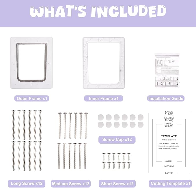 - Easy DIY Installation:The pet door comes with clear instructions and a cutting template for precise placement, allowing quick and simple installation. Suitable for 0.5'' to 2.25'' thick doors or walls (wood, metal, PVC). Tip: For hollow doors, fill the gap with base & spacer before installing