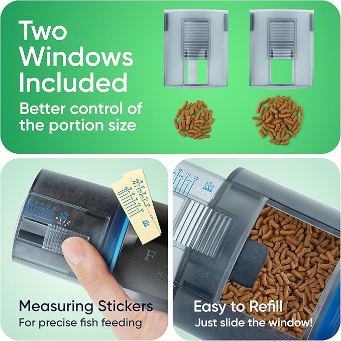 - Dual Feeding Windows for Customized Portions: The FISHNOSH feeder includes two feeding windows in different sizes, making it easy to control portion sizes for different types of fish food. Whether you need smaller or larger servings, the sliding dosator windows allow you to precisely adjust the amount of food, ensuring ideal feeding for all types of fish.