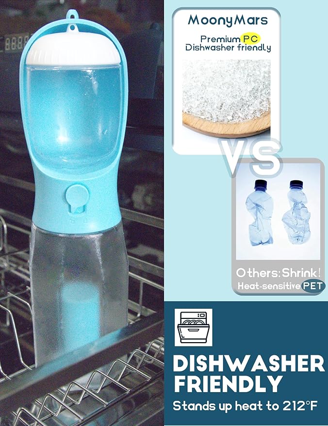 - Dishwasher friendly: crafted from food-grade ABS+PC, BPA-free, our dog water bottle withstands 212℉/100℃, dishwasher-friendly. Perfect for dog walks, travel & trips, picnics, camping, hikes, or any pet-parenting adventure.