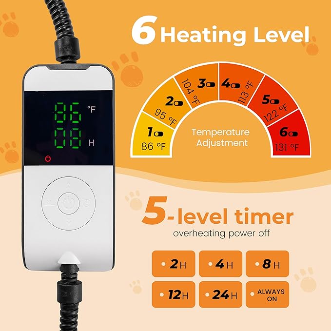 - 【30 W Wide-Zone Heat | 6 Precise Levels】 – Warms 500 cm² edge-to-edge; great for multi-pet homes, senior joint care.
