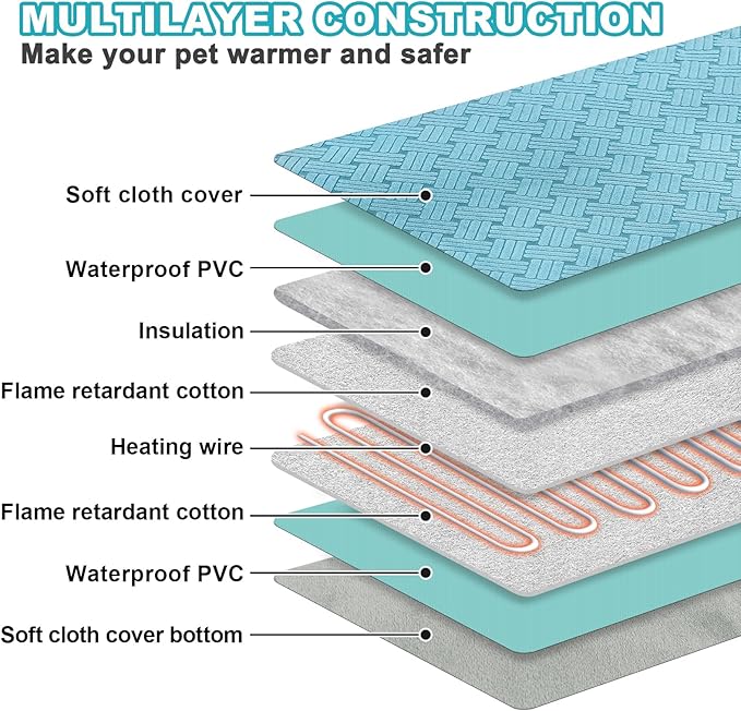 - 🐩【SAFETY GUARANTEED】 The pet heating pad features a 7-layer protective structure with UL-approved heating wire to protect your dog from burns.Meanwhile,the inner layer of the heating pad has a built-in smart temperature sensor to avoid overheating and protect your pet's safety.