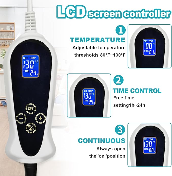 - 🐩【UPGRADED INTELLIGENT THERMOSTAT FUNCTION】Our heating pads are equipped with an intelligent thermostat controller with a new "on" function,which eliminates the need to switch the pad on and off every day, and can control the temperature between 80℉~130℉,and the on time can be adjusted freely between 1h~24h,providing your kitten with a comfortable temperature,and your kitten can have a warm winter. Please note that after use,please turn off the pet heating pad in time to protect the safety of your family and pets.