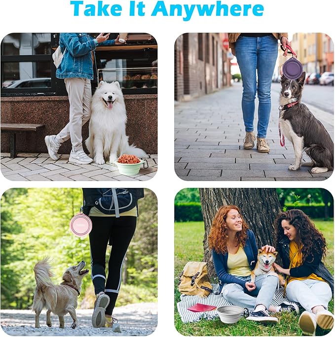 - Portable and Convenient: The collapsible dog water bowl are foldable, lightweight and compact, it's very handy when you are on a road trip, travel, dog park, hiking, camping, picnic, etc