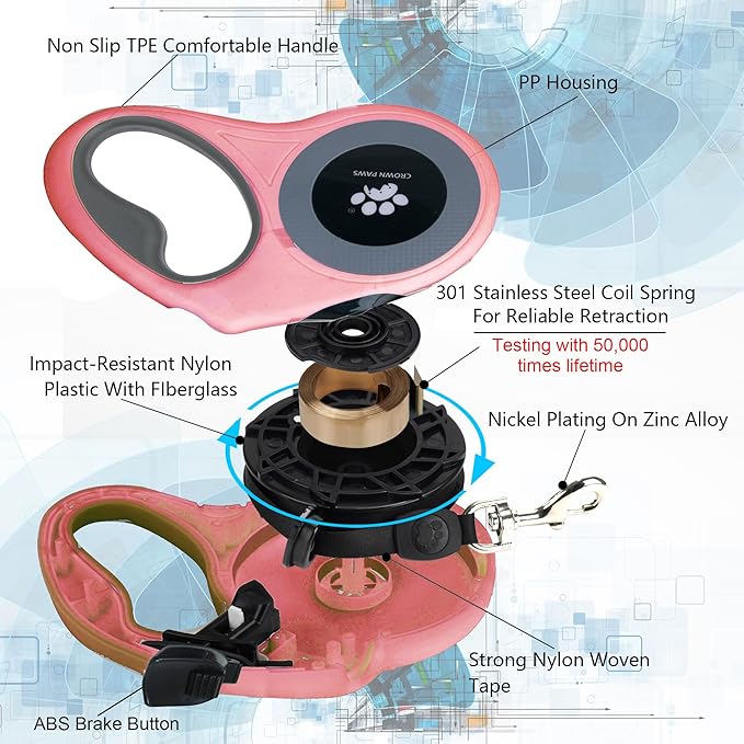 - Size and Color of Leash:The CROWN PAWS Comfort Retractable Dog Leash in PINK ,Tape 16 ft/5 m For dogs up to Extra Large max 130 lbs(60kgs)