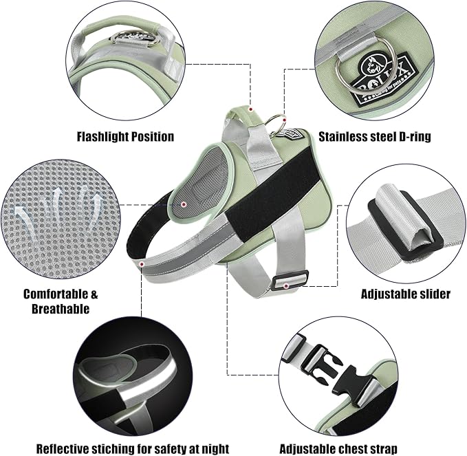 - OUTDOOR HEALTHY: Puppy no pull dog harness with reflective straps to ensure your dog is highly visible and keep dogs safe at night. You can connect the dog leash on the D-ring and with handle is easy to control on crowded streets. The high-end pet harness is perfect for daily walking, running, hiking, training, hunting, outdoor adventure and more!