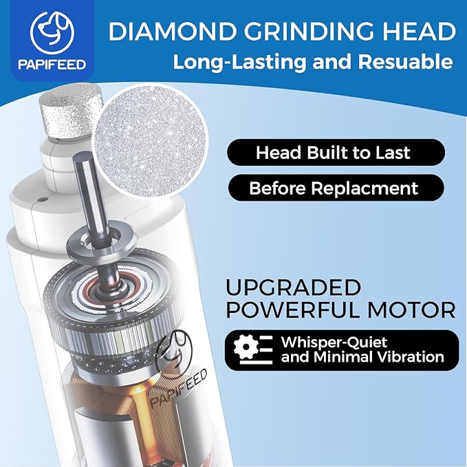 - 🐾【WHISPER QUIET&MINIMAL VIBRATION】With the latest mute technology and innovative powerful motor, the PAPIFEED dog nail file operates quietly, emitting less than 40 dB of noise. Additionally, the ergonomic body design of the dog nail trimmers reduces noise and vibration. By being exceptionally quiet and producing minimal vibration, these features help alleviate pets' fear and anxiety during the nail grooming process.