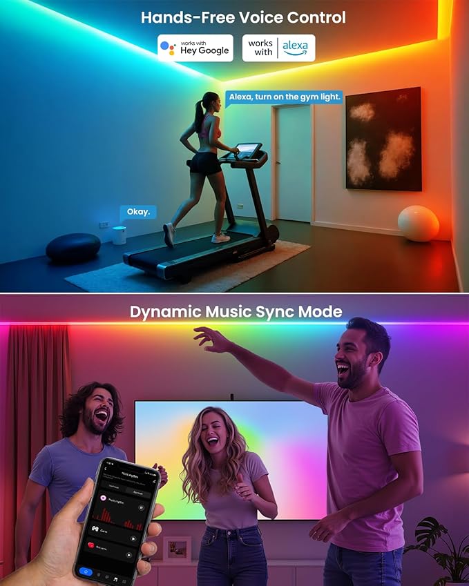 - [Preset Scenes & Music Sync Mode]: Designed with 44 preset scene modes, the LED string lights could create a stunning background with dynamic lighting for intimate get-togethers or lively parties; The strip light is built-in with a high-sensitivity mic in the control box for syncing to the sounds and music and producing gorgeous light effects to your music party; The color and brightness of the lights will jump with the rhythm and volume of the music